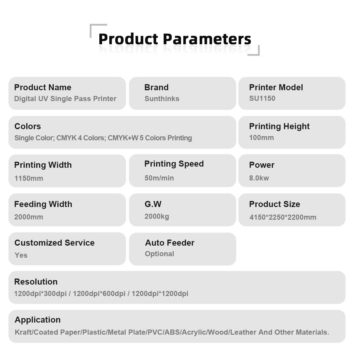 The Sunthinks SU1150 single pass uv printer is an ideal large sized, high speed, single pass uv printing machine, supporting monochrome, 4-color CMYK, or 5-color CMYK+W printing. It's suitable for batch printing and personalized customization across a wide range of industries, including high-end gift packaging, plastic packaging, plastic corrugated paper, coated paper, indoor/outdoor billboards, wood panels, file folders, notebook covers, metal packaging, leather, and various corporate/event promotional gifts.