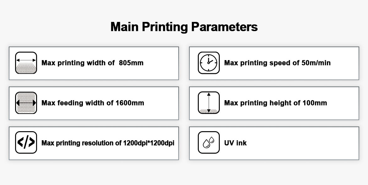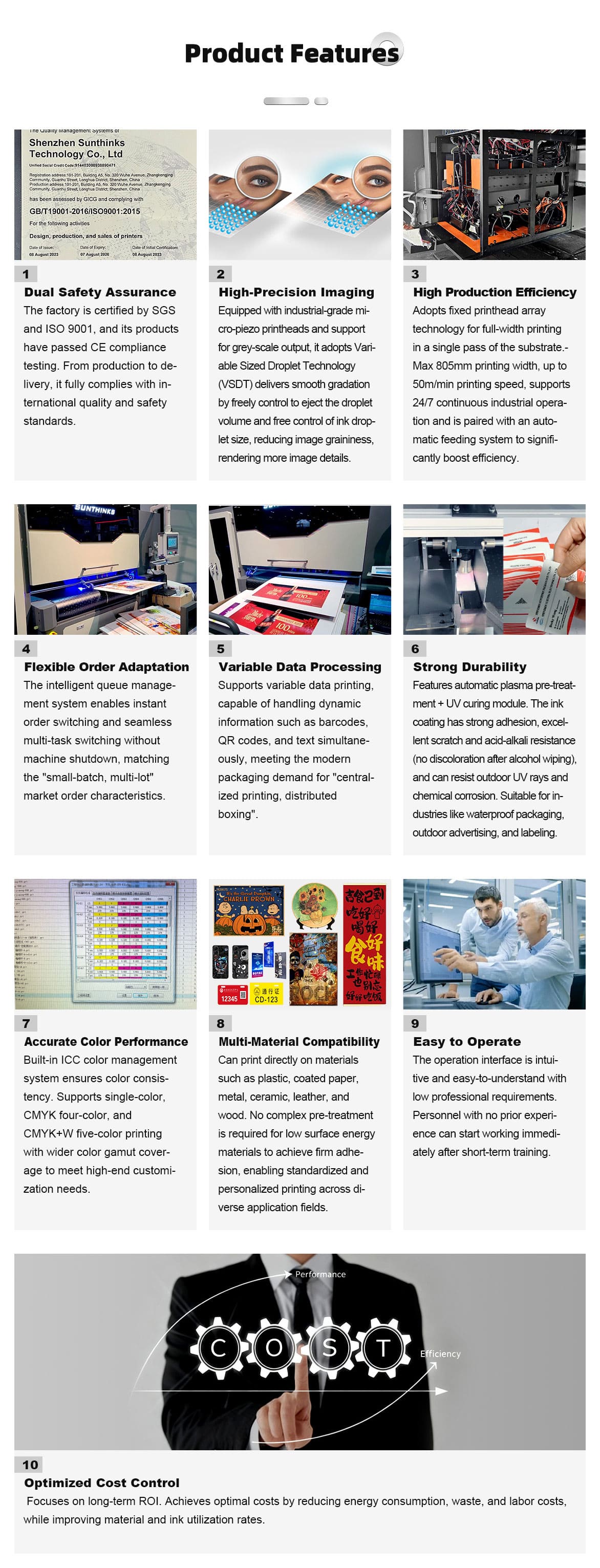 The Sunthinks SU805 single pass uv printer is an ideal large sized, high speed, single pass uv printing machine, supporting monochrome, 4-color CMYK, or 5-color CMYK+W printing. It's suitable for batch printing and personalized customization across a wide range of industries, including high-end gift packaging, plastic packaging, plastic corrugated paper, coated paper, indoor/outdoor billboards, wood panels, file folders, notebook covers, metal packaging, leather, and various corporate/event promotional gifts.